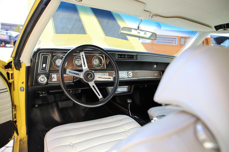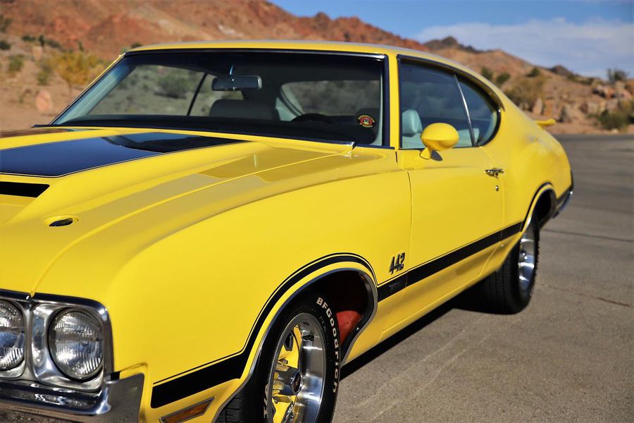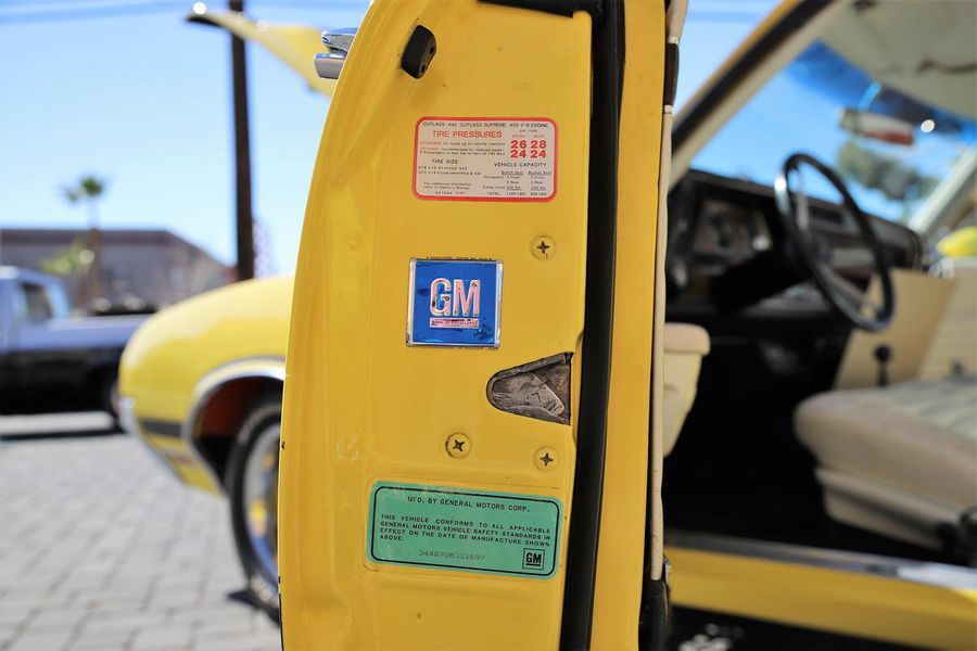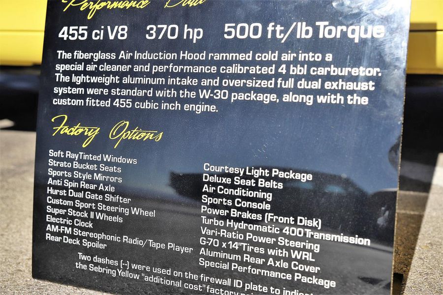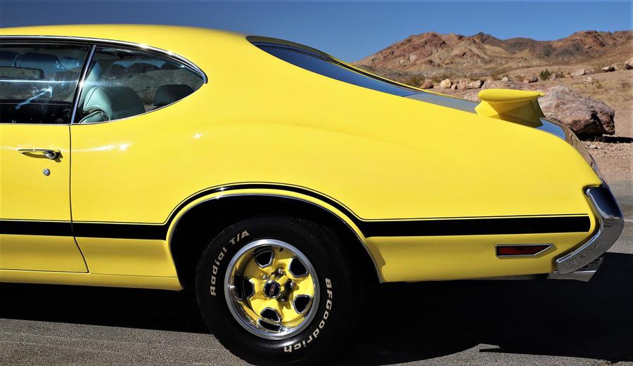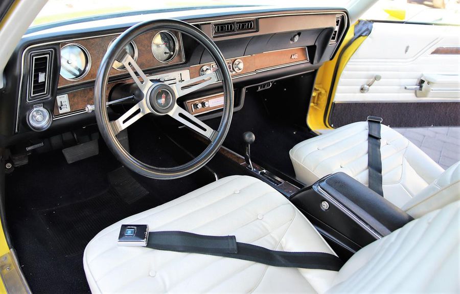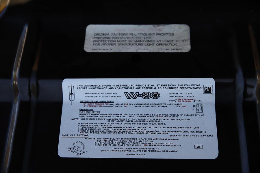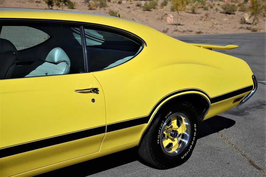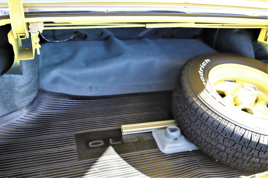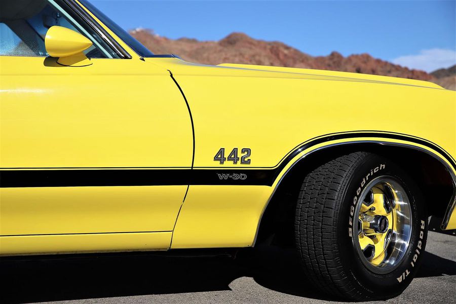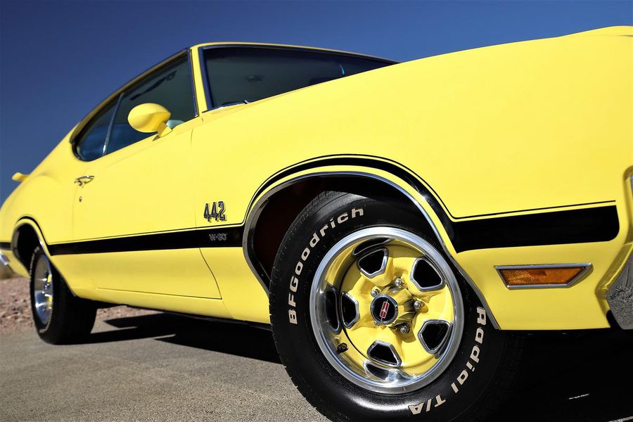 A stunning concourse restoration of a 1970 Oldsmobile 442 with the desirable and rare W-30 performance option. But this car goes far beyond being a W-30. The stunning color combination of Sebring Yellow with White interior AND the dual-gate automatic transmission, Am/FM 8 Track and air conditioning. We’ll be willing to bet that this is the only example with these features. Leading to the… reason this car has been on many magazine covers and articles. The W-30 option included the venerable 455 cu in V8 with the fiberglass hood with integrated air ducts feeding into the low restriction air cleaner. The engine was tuned for greater performance, making sure that this was not your mothers Buick! The automatics used for the W-30’s used the dual-gate Hurst shifter and were tuned especially for the car. The power is delivered through the 3.42 Posi traction rear end. We love the iconic red fiberglass inner fender wells that separate the W-30s from other 442s.