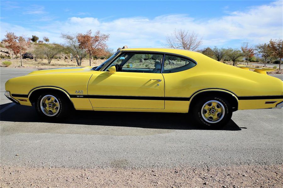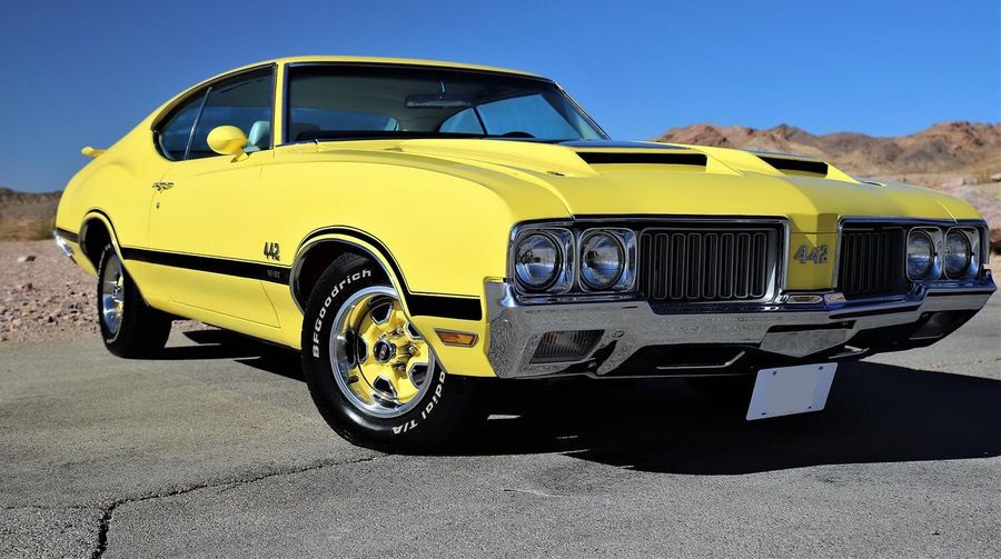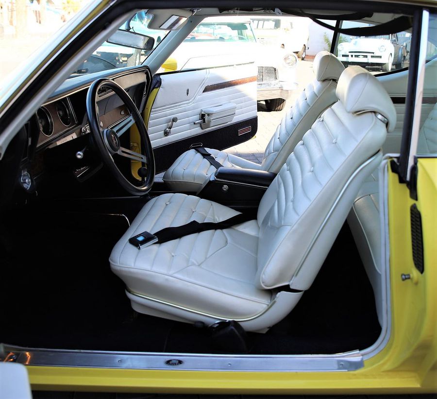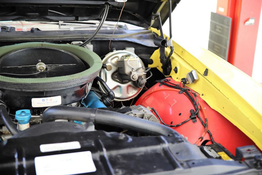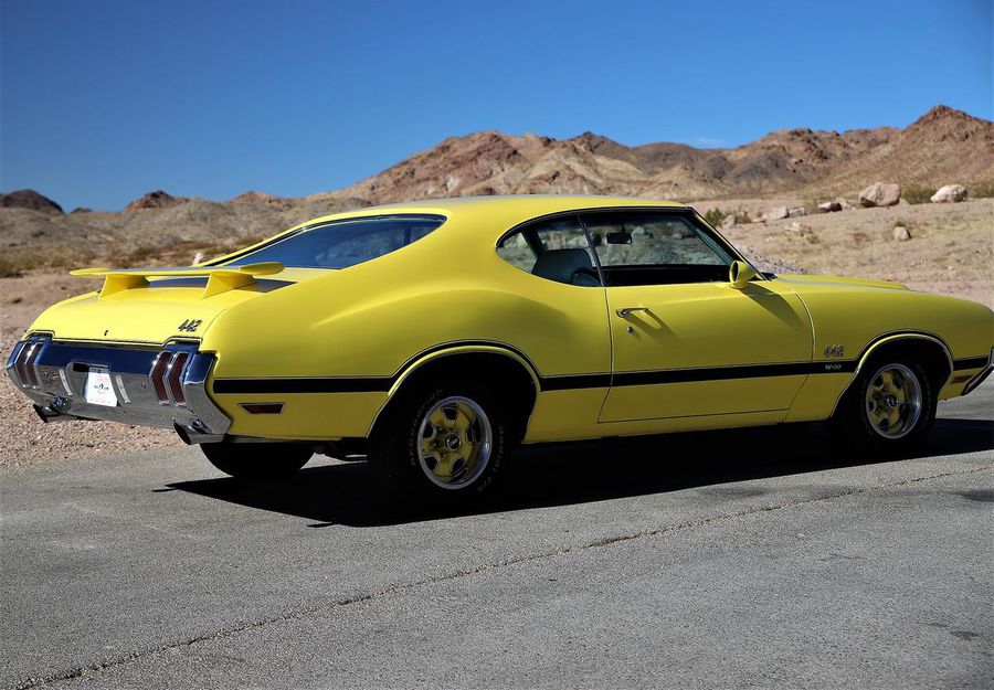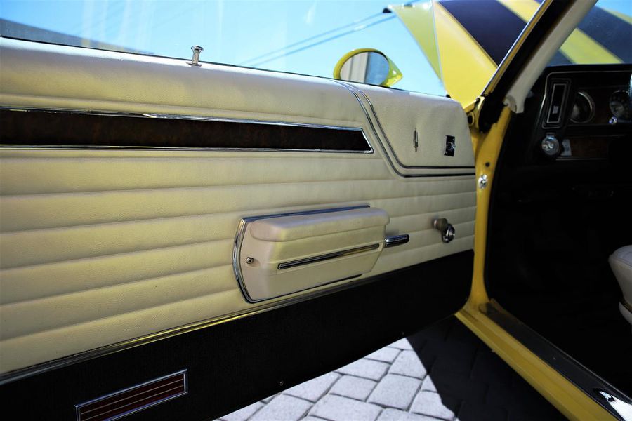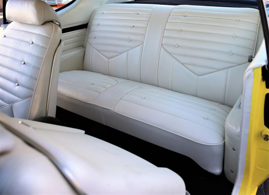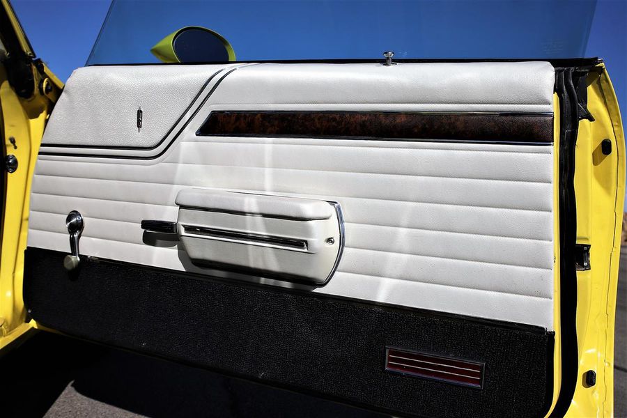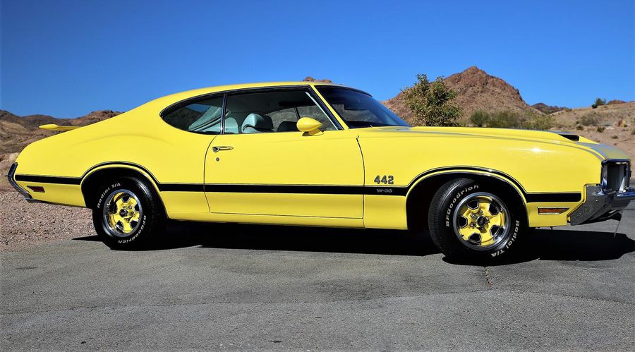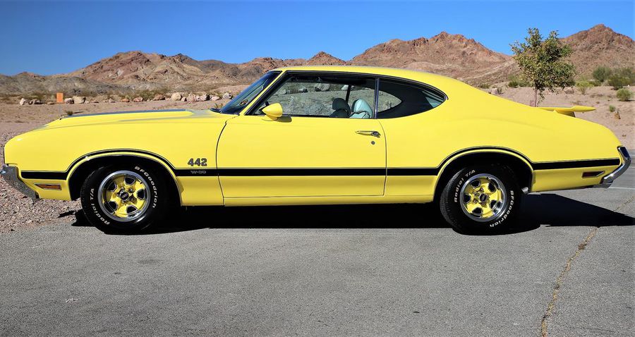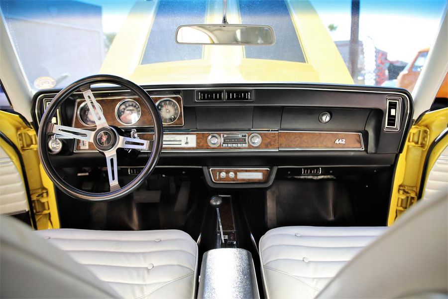 A stunning concourse restoration of a 1970 Oldsmobile 442 with the desirable and rare W-30 performance option. But this car goes far beyond being a W-30. The stunning color combination of Sebring Yellow with White interior AND the dual-gate automatic transmission, Am/FM 8 Track and air conditioning. We’ll be willing to bet that this is the only example with these features. Leading to the… reason this car has been on many magazine covers and articles. The W-30 option included the venerable 455 cu in V8 with the fiberglass hood with integrated air ducts feeding into the low restriction air cleaner. The engine was tuned for greater performance, making sure that this was not your mothers Buick! The automatics used for the W-30’s used the dual-gate Hurst shifter and were tuned especially for the car. The power is delivered through the 3.42 Posi traction rear end. We love the iconic red fiberglass inner fender wells that separate the W-30s from other 442s.