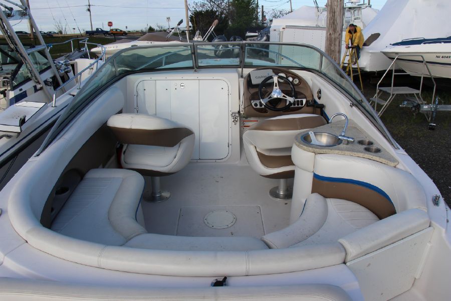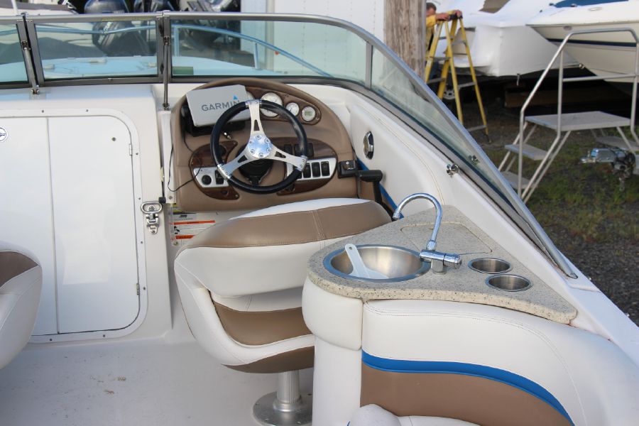 Run the boat in comfort with a full glass wind shield with a step through opening on the centerline. The captains chairs are comfortable and set at the proper height for great visibility while cruising the lake or bay. At the helm is a Garmin 74SV with fish finder and chart plotter.