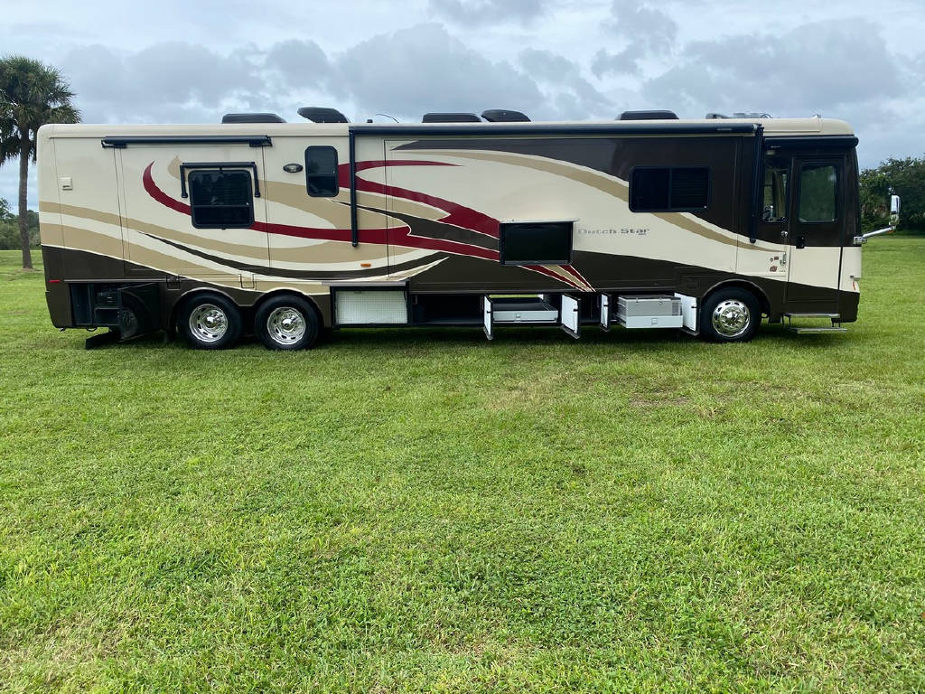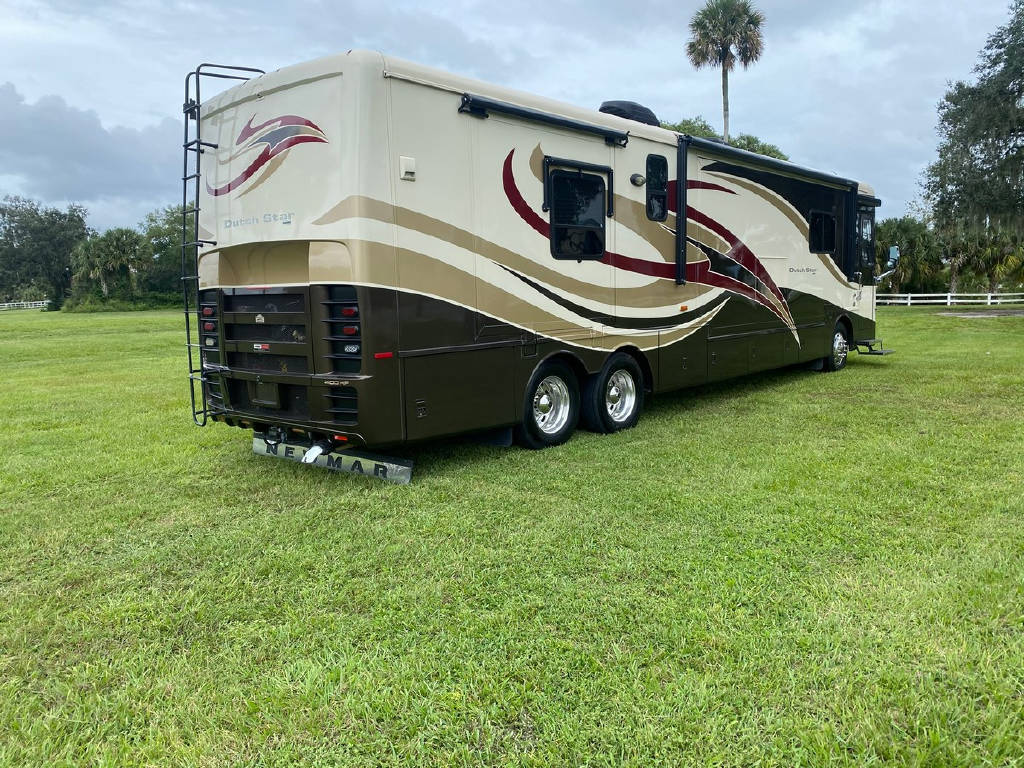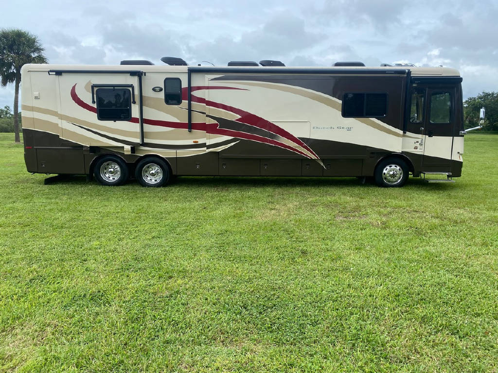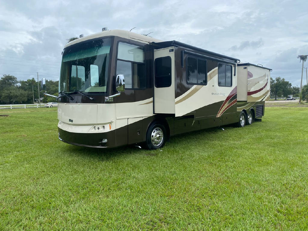 2011 Newmar Dutch star 4353 4 slide motorhome with 53,424 miles. This coach is on a Freightliner chassis powered by a 400HP Cummins Diesel with Allison Transmission. This coach has everything including comfort drive, tile floors, residential fridge, King bed, HD TVs, outdoor entertainment, pass-through storage & more !!!