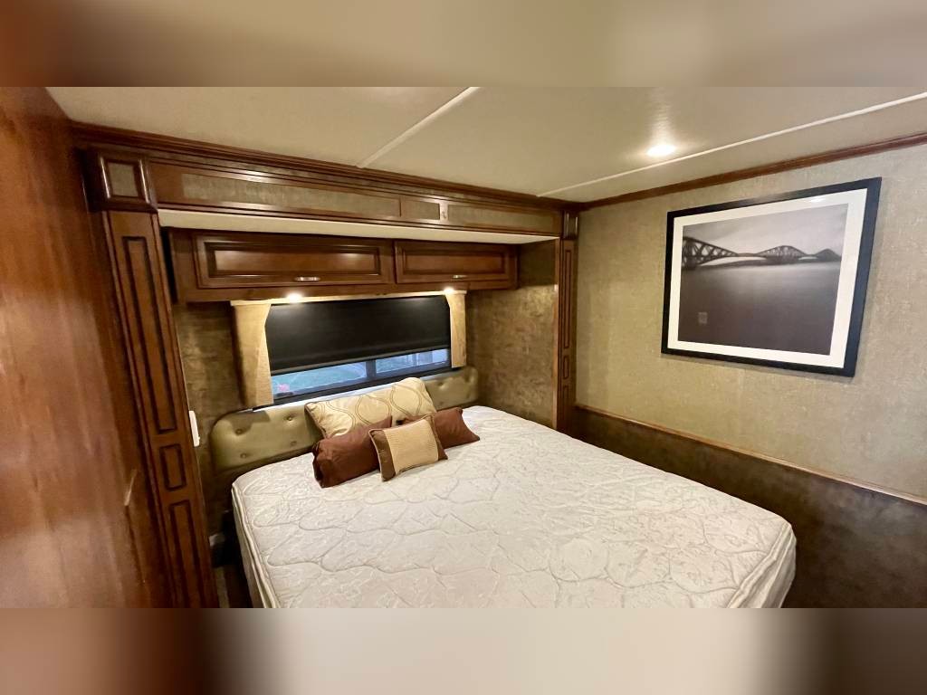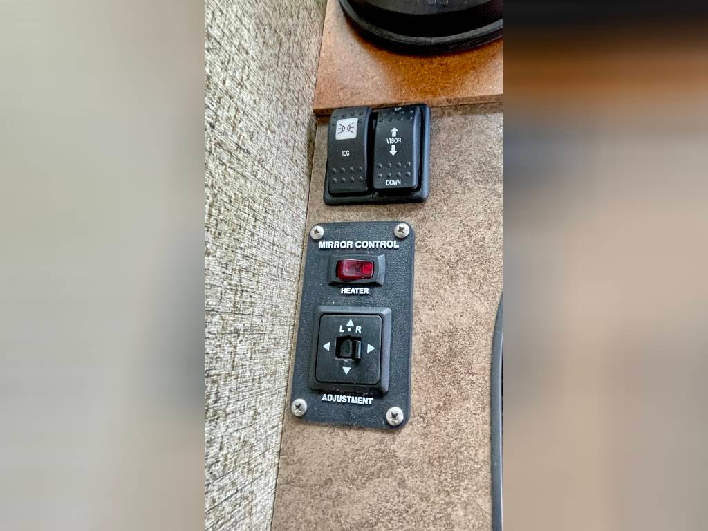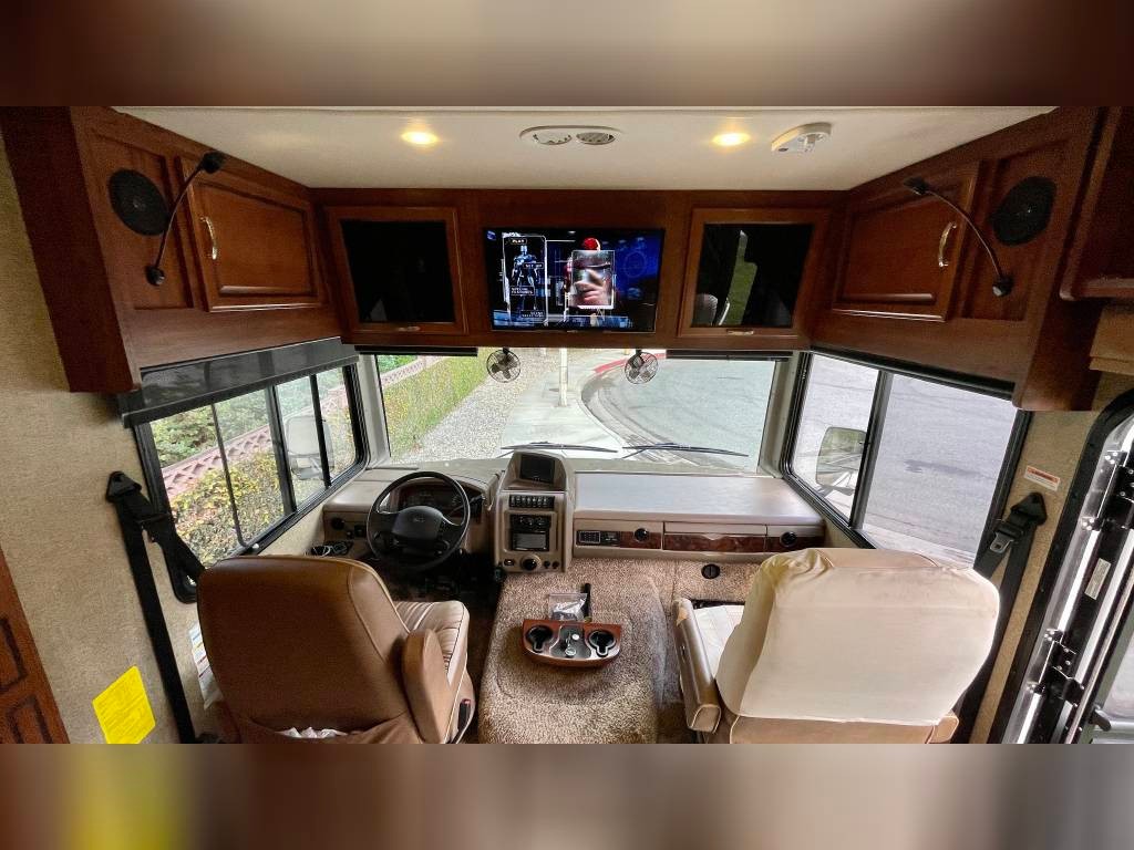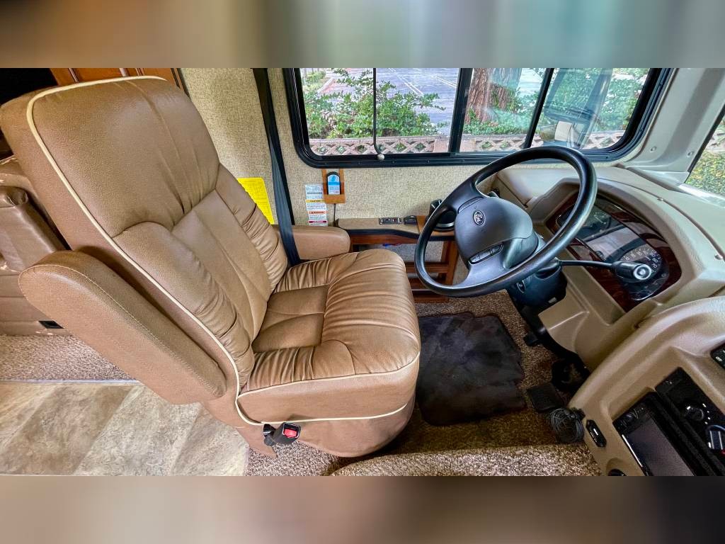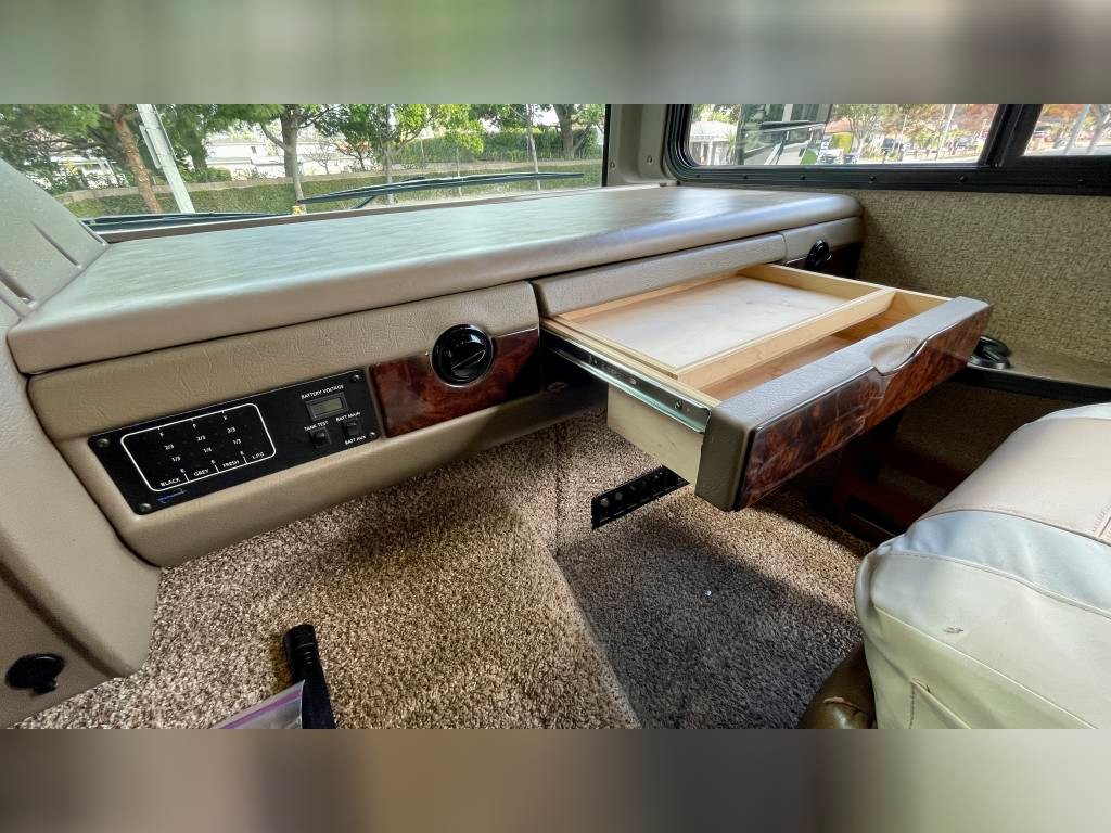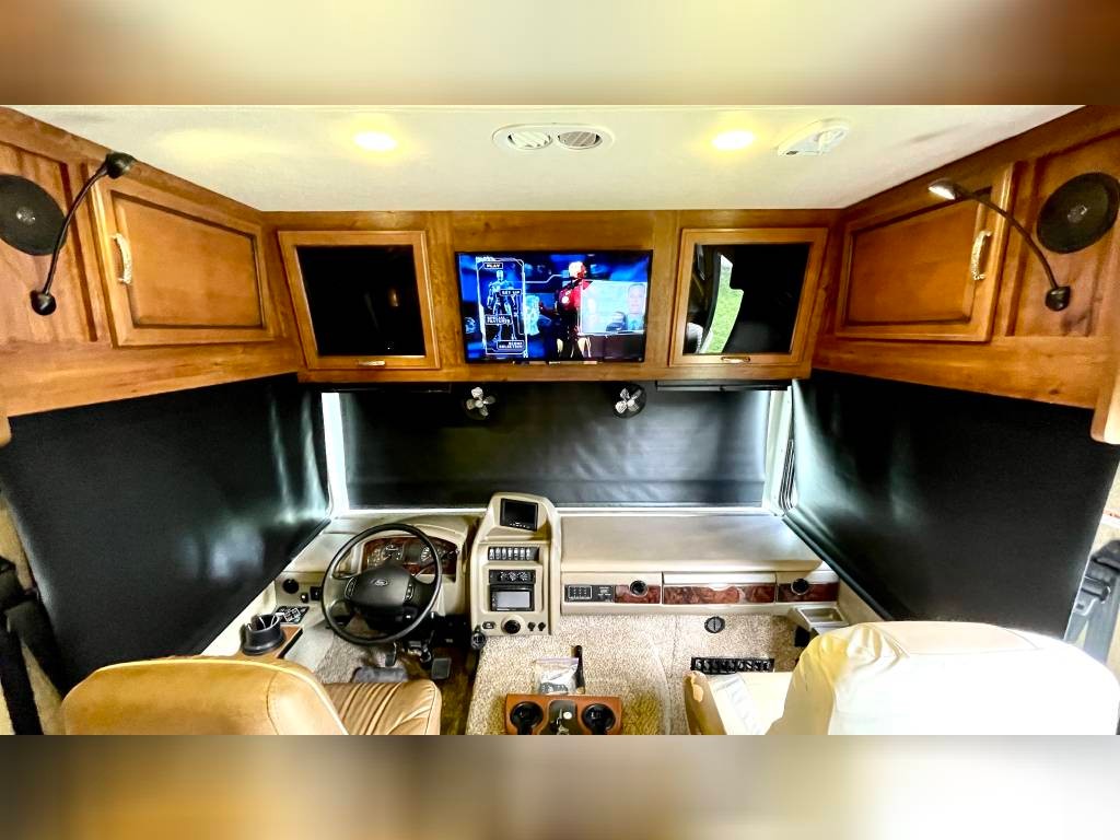 Front of the coach has an electric blackout shade across the windshield and two side blackout shades. Keeping the heat or cold out while giving you all the privacy you need. Leather driver seat with power massage, the passenger seat has two pull out shelves. 1st for a laptop or something to read, plus a 2nd lower drawer great for keeping on the road items handy.