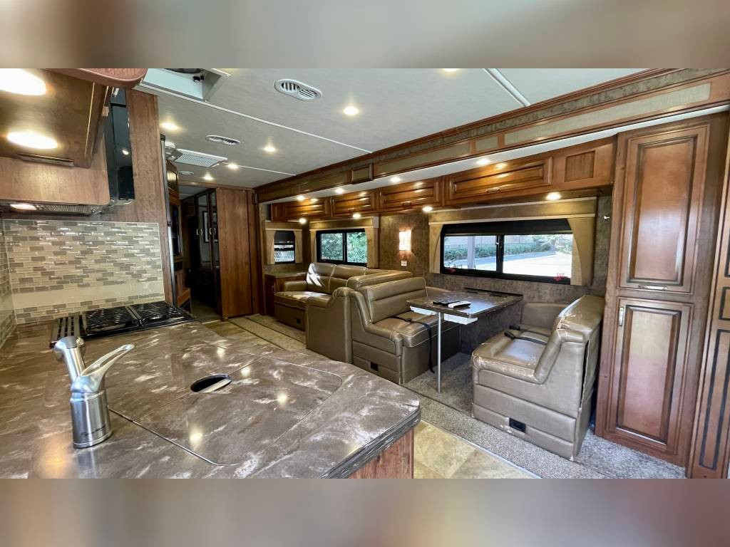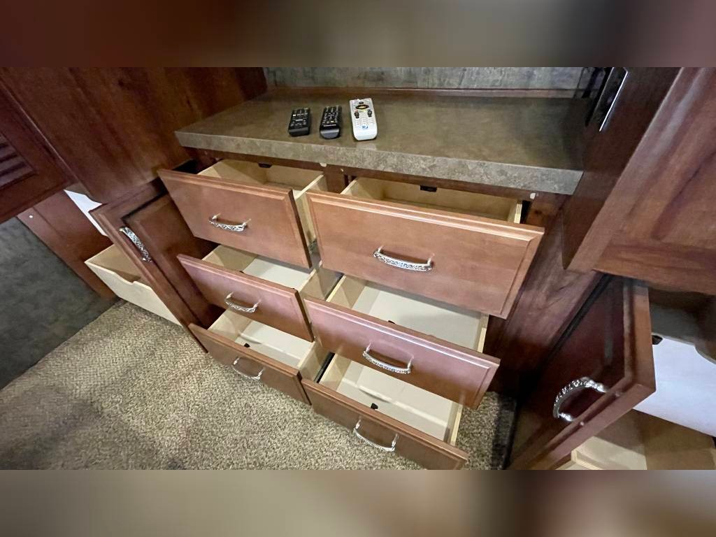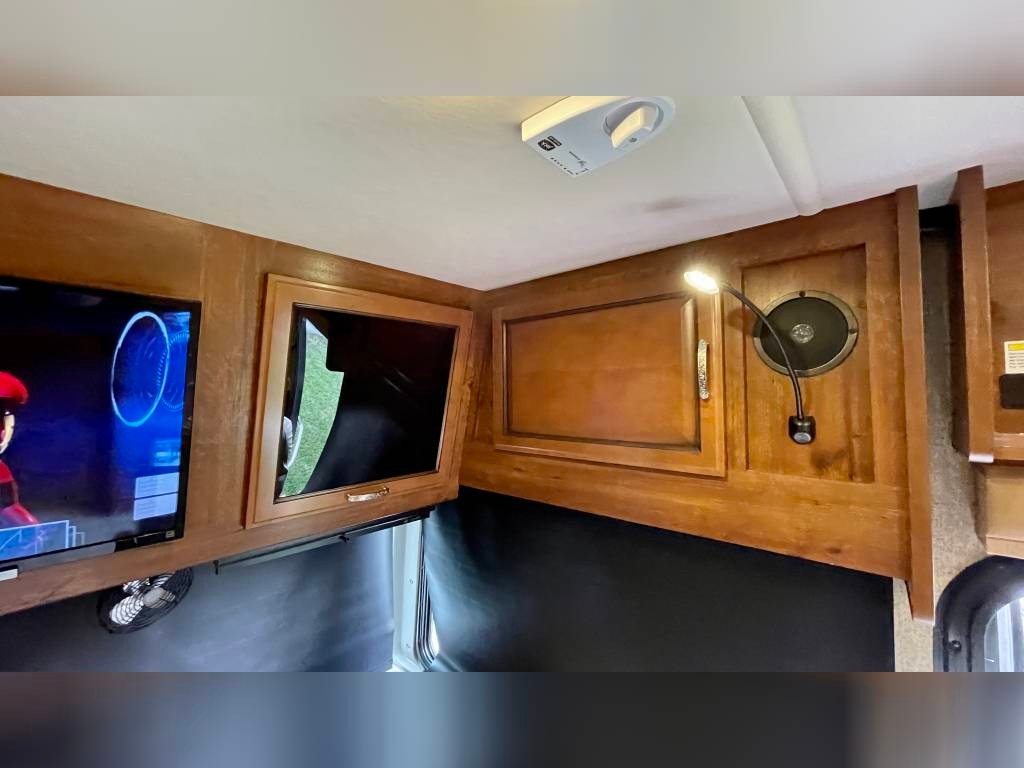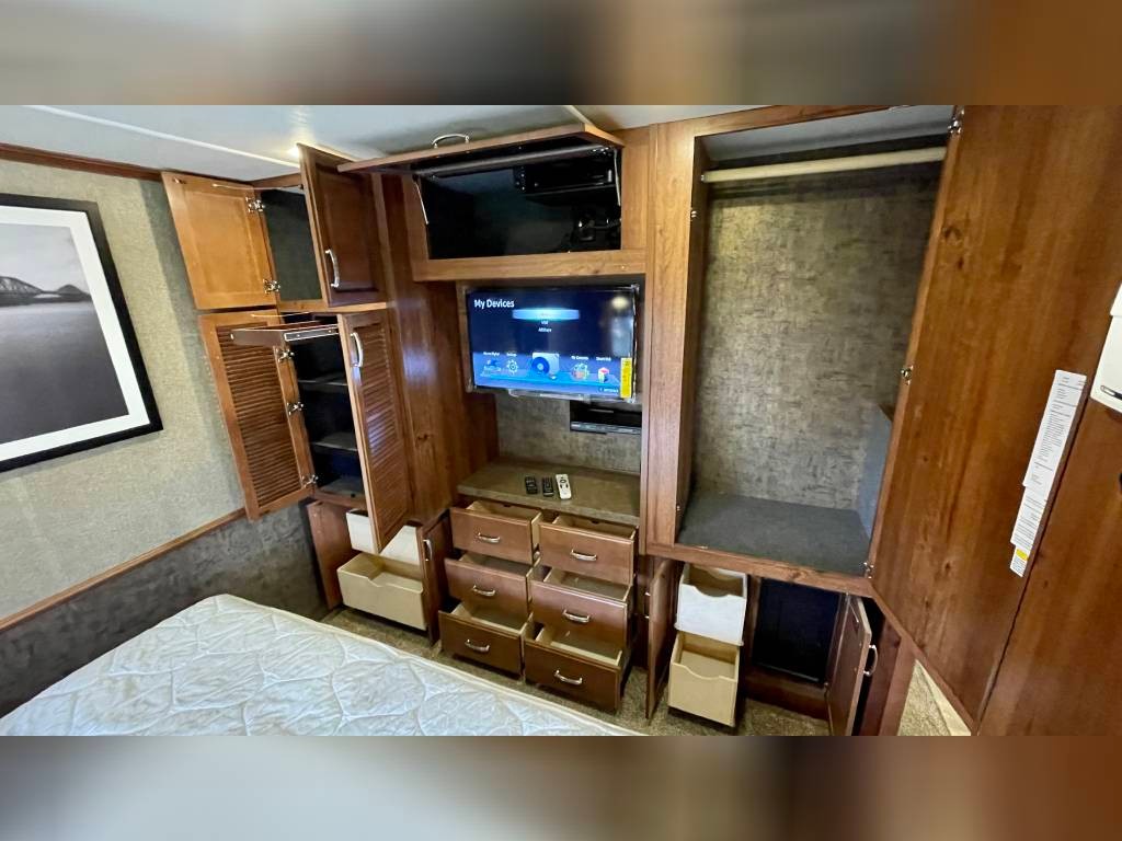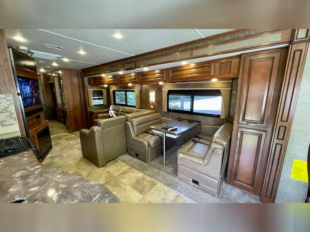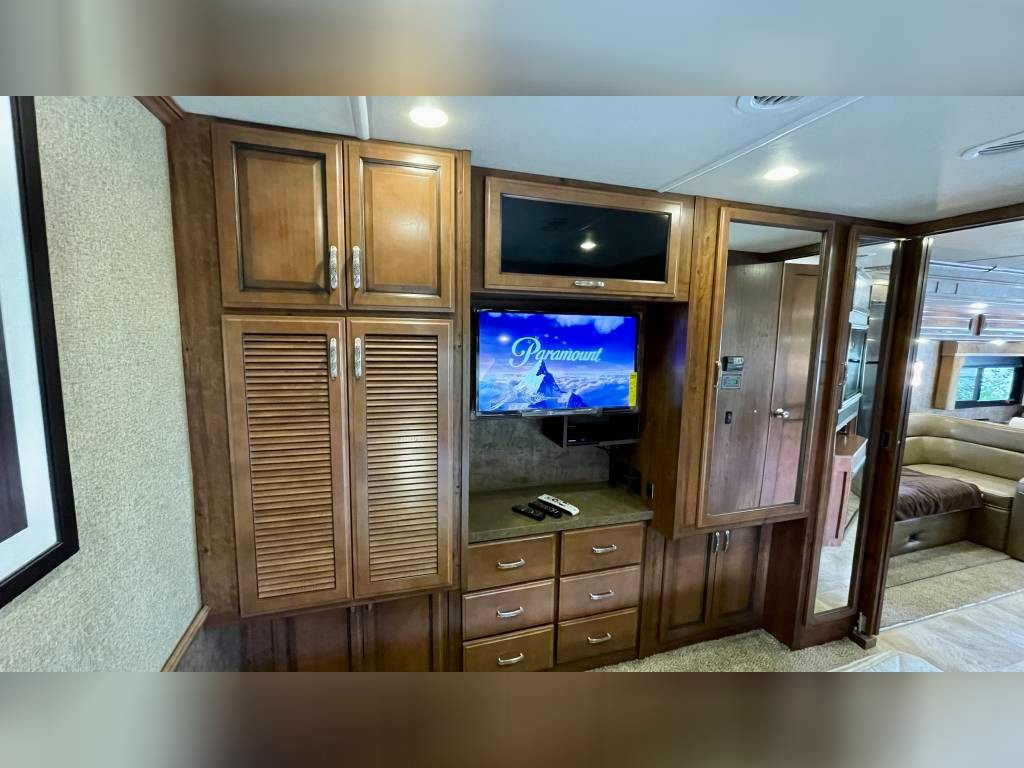 Front of the coach has an electric blackout shade across the windshield and two side blackout shades. Keeping the heat or cold out while giving you all the privacy you need. Leather driver seat with power massage, the passenger seat has two pull out shelves. 1st for a laptop or something to read, plus a 2nd lower drawer great for keeping on the road items handy.