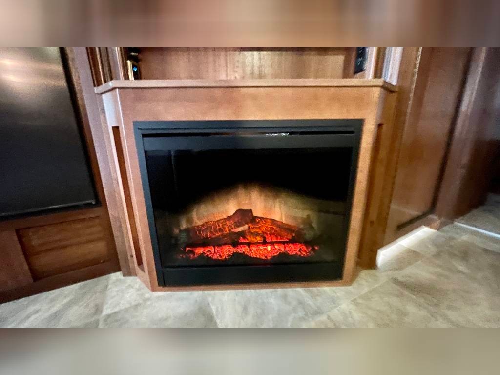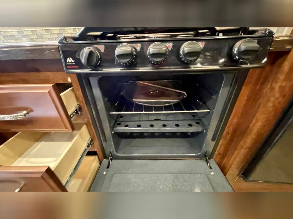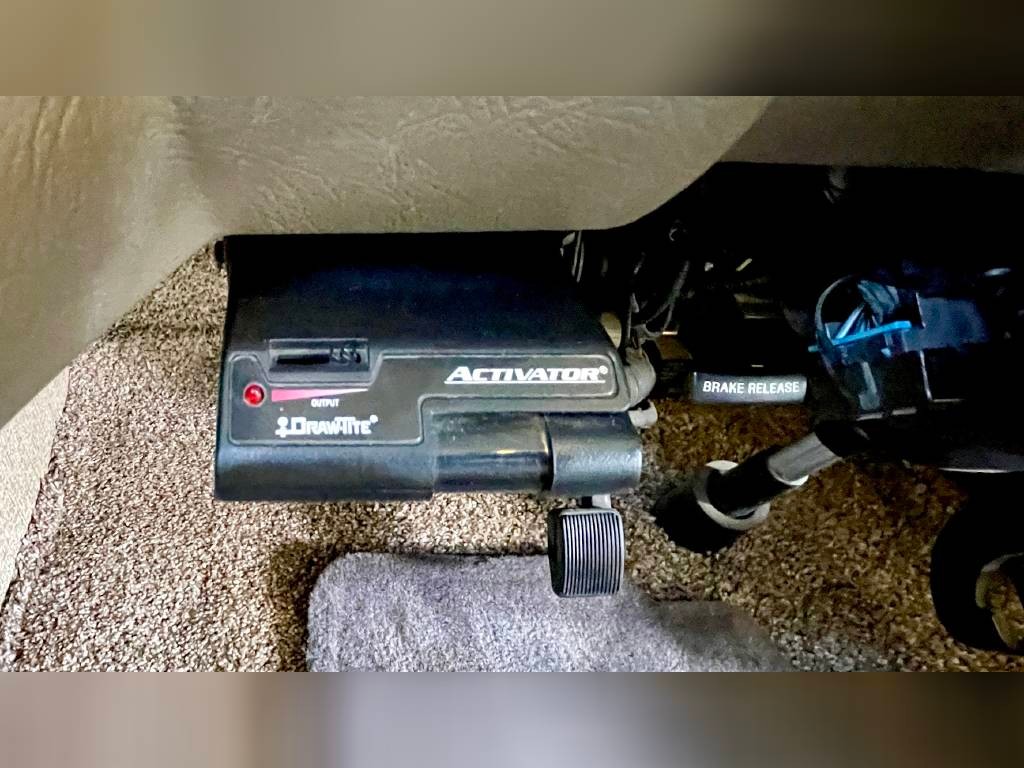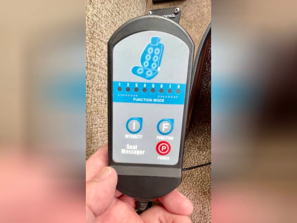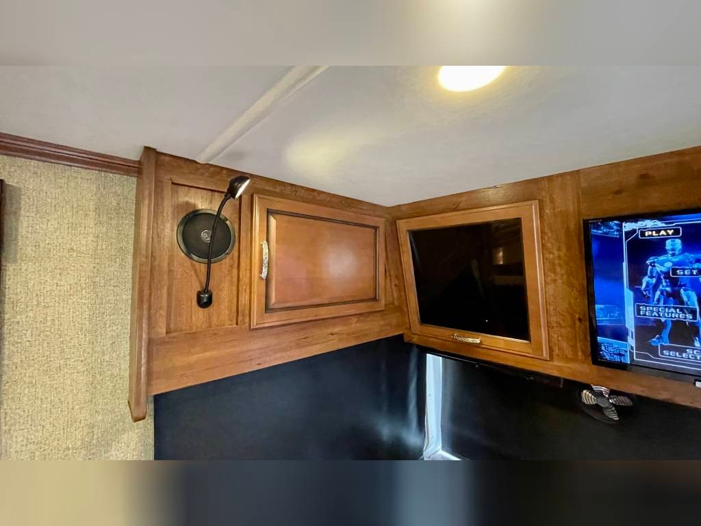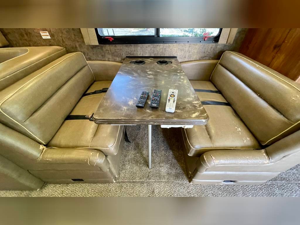 Front of the coach has an electric blackout shade across the windshield and two side blackout shades. Keeping the heat or cold out while giving you all the privacy you need. Leather driver seat with power massage, the passenger seat has two pull out shelves. 1st for a laptop or something to read, plus a 2nd lower drawer great for keeping on the road items handy.