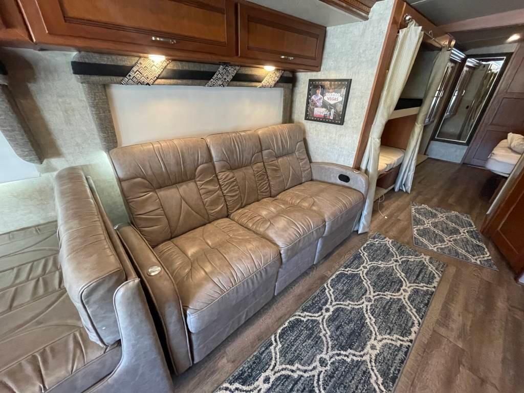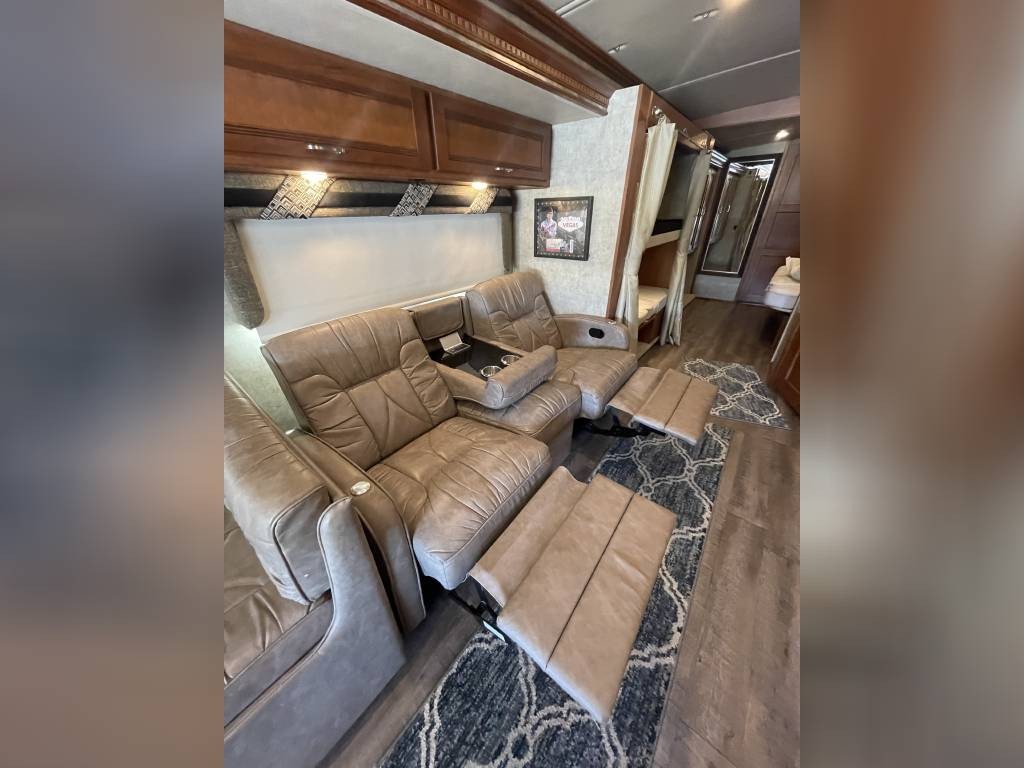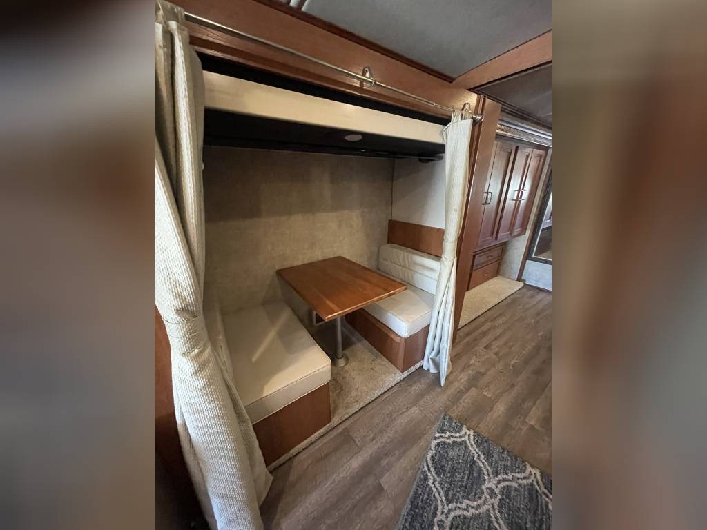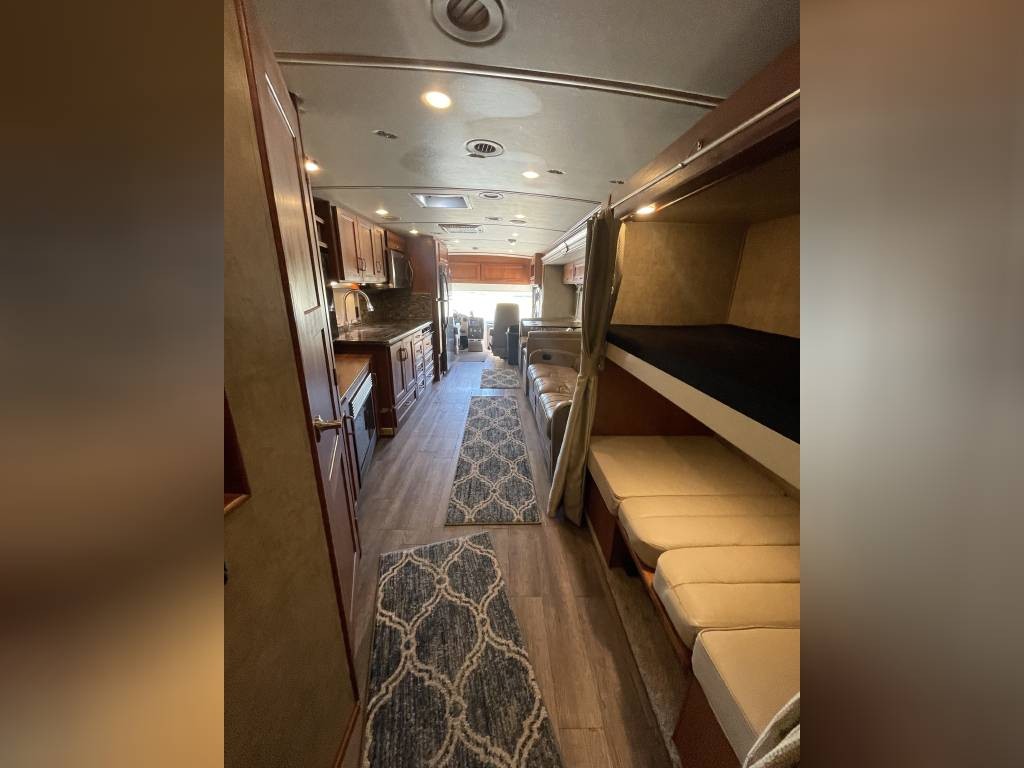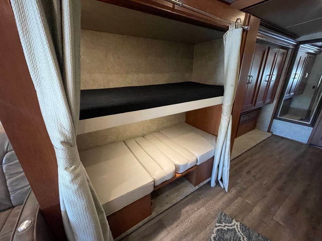 Queen bed in bedroom, mid coach dinette that converts to bunk beds, recliner couch, and main dinette that converts to a bed.