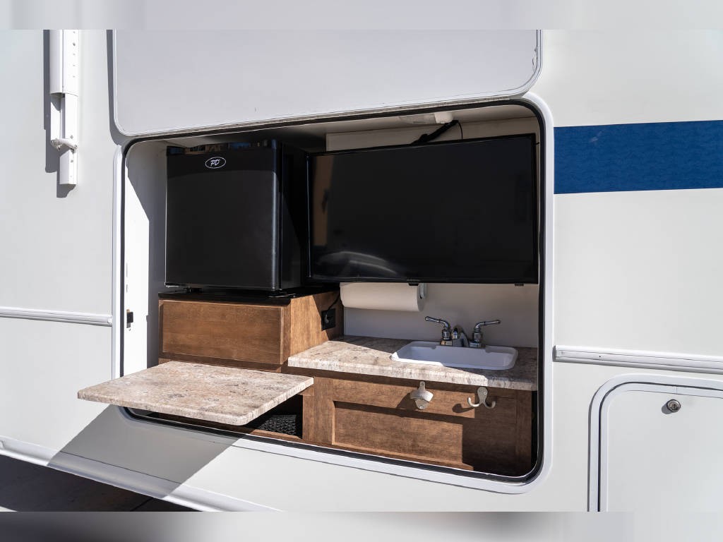 Upgraded with modern amenites and ready to hit the road while staying connected! Very clean, 14,900 miles on ODO, Triton V10 with 6-speed trans. Kitchen has been remodeled/updated to a brighter, more modern feel. Upgraded electrical system with larger capacity Battle Born lithium batteries & larger Victron Energy inverter/charger that’s wired to all the outlets (originally just fridges and TV) so everything has power when using just the batteries (AC excluded; that still requires shore power or generator). Sofa has been removed and replaced with an office area that is equipped with a pull-out desk, outlets, and padded trays to keep electronics safe and charged while traveling.