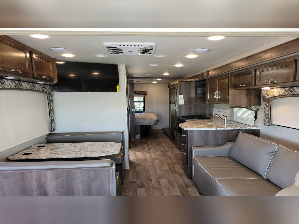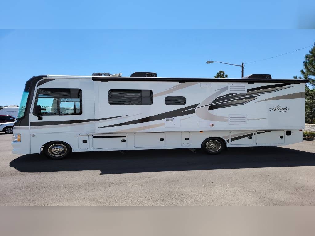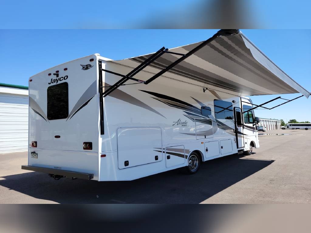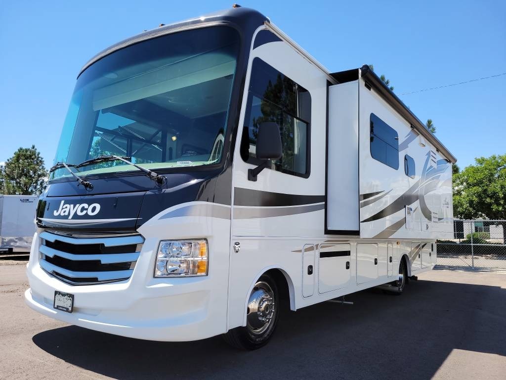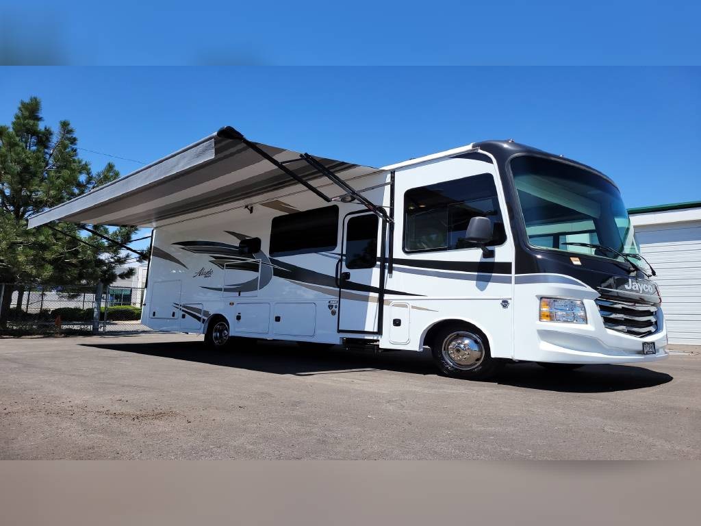 2019 Jayco Alante 29S Class A Gas RV for sale in Denver. Ford Triton V10 6.8L Fuel Injected Gas Motor w/only 1,795 Miles, Torqshift 6-Speed Automatic Transmission w/Overdrive & Ford F53 Super Duty Chassis w/Upgraded J-Ride Front & Rear Chassis Stabilizers Bars, Power Auto Leveling System, Hydraulic Front & Rear Disc Brakes, Goodyear G670 RV Tires DOT 17/18, 4K Onan Generator w/only 21 hrs., Outside Kitchen w/Sink & Refrigerator Plus Outside 32” LED Insignia Flat Screen TV w/Swivel Bracket plus Furrion Stereo & External Speakers, 23’ Power Patio Awning, Pass-Through Storage, 1,000 Watt Inverter, Power Drop Down Bunk, 5k Tow Capacity, 1-Large Drive Side Slide Out, Direct TV Stationary Satellite System w/32” Flat Screen TV Living Room w/CD & DVD Player & Back up Camera & Side Cameras Plus GPS, (2) 15K BTU Ducted AC Units & 30,000 BTU Furnace Plus 6 Gal. Water Heater, 120” Panoramic 1-Piece Windshield & 1-Piece Fiberglass Roof & 6-Way Power Driver’s Seat and Both Seats Swivel w/Middle Removable Table. 3-Burner Stove w/Oven, High Point Microwave, Large Electric/Propane 2-Door Refrigerator (No Ice Maker) & Double Stainless-Steel Sinks, Booth Dinette, Jack Knife Sleeper Sofa, Queen Bed w/Under Storage, Large Bedroom Closet w/Dresser Drawers, Roller Vinyl Window Shades, Large Shower w/Foot Flush Toilet. Exterior Length 31’4”, Exterior Height 12’5”, Internal height 7’, Fresh Water 72 Gal., Gray 49 Gal., Black 50 Gal., Fuel 80 Gal., LP 16.5 gal. RV weight w/LP & Fuel 15,446 lbs., GVWR 23,000 lbs. Non-Smoking RV & No pets.